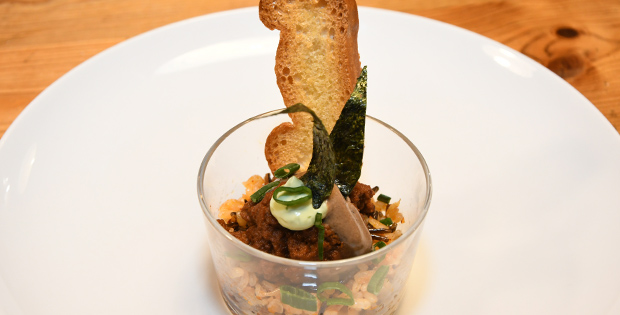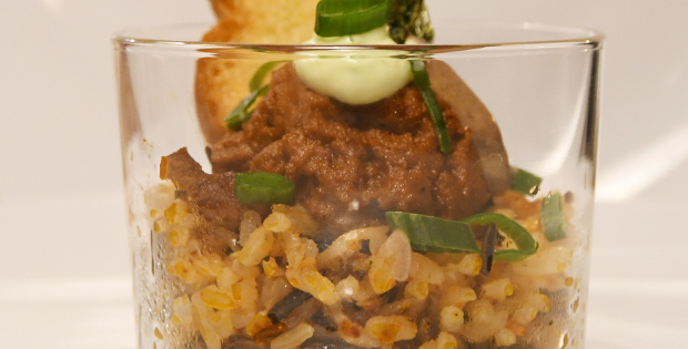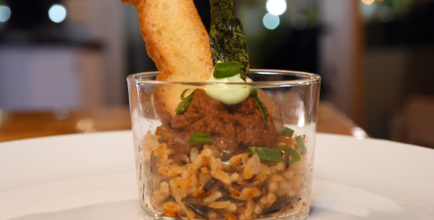 Mix de arroz y crema de nyora con emulsión de ajo negro y alga nori. Maridalo con una cerveza 1/5 Alhambra o una copa de vino Embaucador.