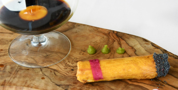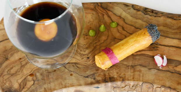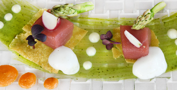 PINCHO/ TAPA Habanito de atún rojo 6 € PLATO Tataki de atún con crema de albahaca, parmentier de wasabi, espárragos verdes y aire de piña 18 €
