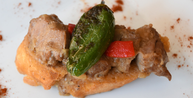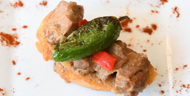 Carrillera de cerdo ibérico al aroma de mistela y sobre crotón. Horario de Tapa: De 11:00 a 16:00 y de 19:00 a 23:00