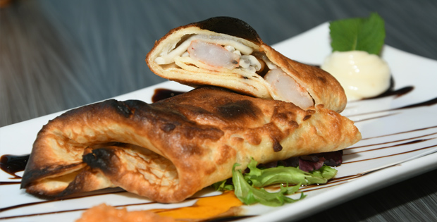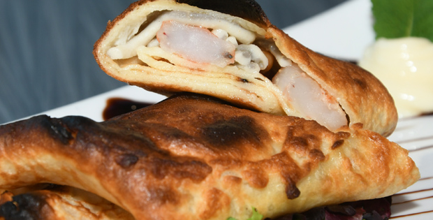Pasta Brice rellena de gambas y gulas al ajillo. Horario de Tapa: De 11:00 a 17:30