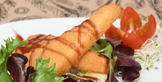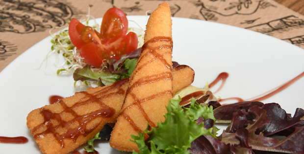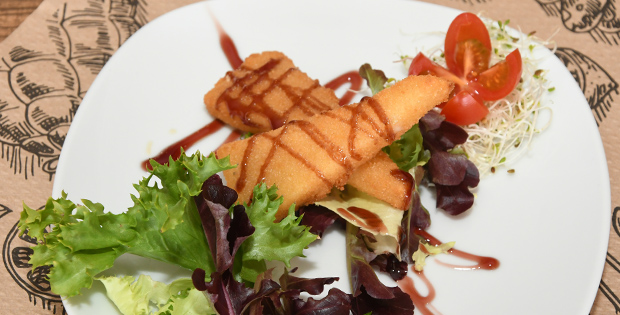 Queso frito con salsa , pimienta y reducción de frutos rojos.