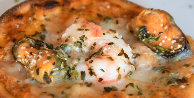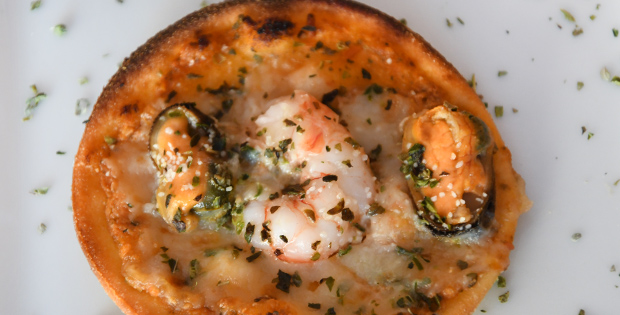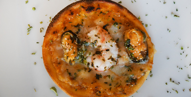 Mini pizza de langostinos y mejillones con base de salsa de pesto.