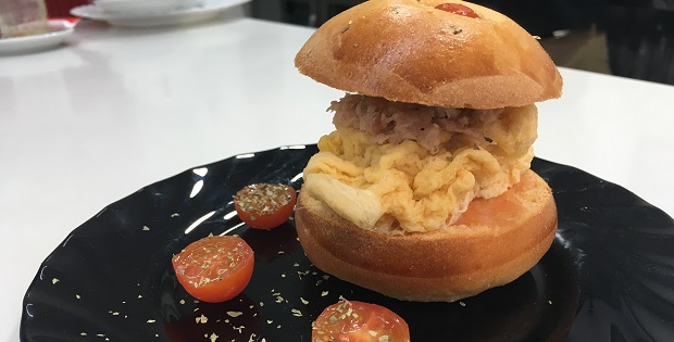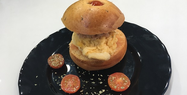 Brioche casero de tomate con tortilla francesa y atún. Horario de 6 a 14 horas.