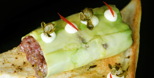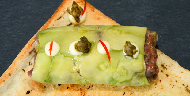 Steak tartar macerado al estilo tradicional, presentado con una fina lámina de aguacate que lo envuelve.