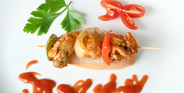 Brocheta de pechuga de pollo, cebolla, pimiento, rojo y verde con salsa de curry. HORARIO TAPA DE 10.00 A 0.00