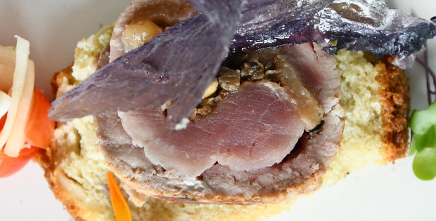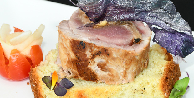 Solomillo relleno de membrillo, setas y nueces, cortado en medallones sobre una base de pan de cabrales, rociado con una reducción de Pedro Ximénez y decorado con un cristal de patata morada. HORARIO DE TAPA DE 12.00 A 0.00