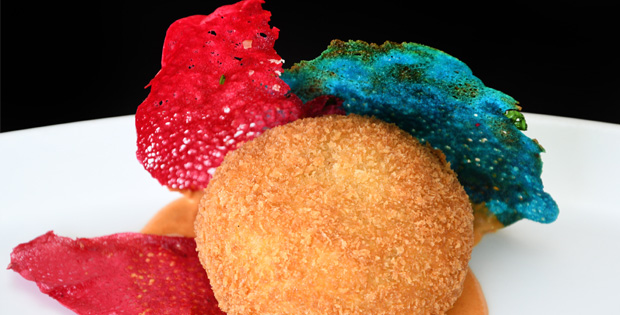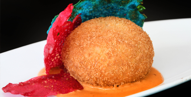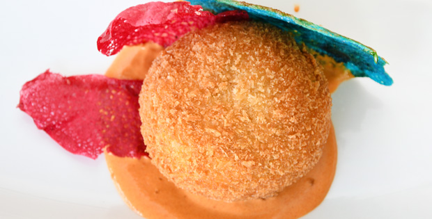 Crujiente croqueta de puré de patata con bacalao desmigado y crema de pimiento de piquillo. HORARIO TAPA DE 12.00 A 0.00