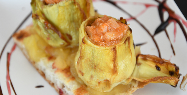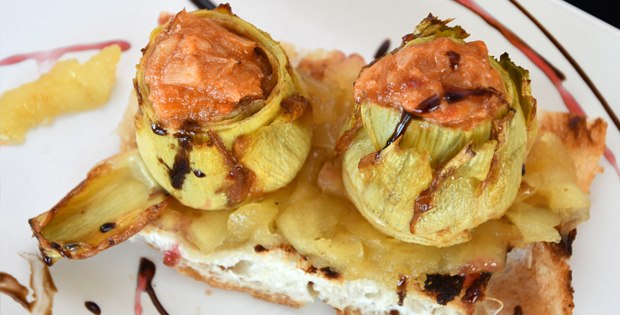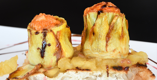Impresionante mezcla de sabores de alcachofas de la huerta con el dulzor de la compota de manzana, fusionado con sabor del norte de nuestro bacalao al ajoarriero.