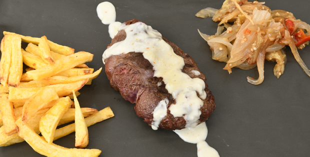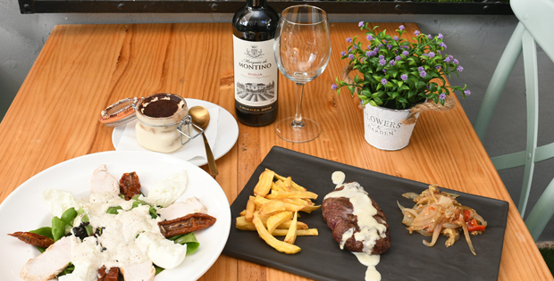 Entrante: Ensalada Fiorentina con lechuga viva, pollo a la parrilla, tomate semiseco y mozzarella de búfala. Principal: Entrecote con crema de queso Gorgonzola, patatas fritas y escalibada. Postre: Tiramisú casero. Bebida: Vino, cerveza, refresco o agua.