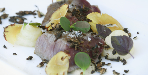 Ternera madurada 4 meses sobre una tierra de setas de temporada con emulsión de membrillo a baja temperatura y manzana natural. HORARIO DE TAPA: Lunes y Martes de 12:00 a 19:00hrs. y de Miércoles a Domingo de 12:00 a 22:00hrs.