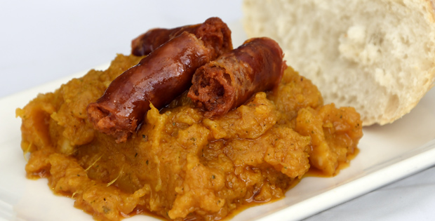 Calabaza frita con patata fusionado con mojado de ajo y pimentón acompañada de chistorra. HORARIO DE TAPA: De 9:00 a 17:00hrs. Domingos cerrado.