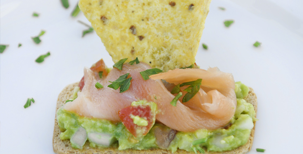 Tosta de aguacate, tomate, cebolla, ajo, aceite, sal y gota de limón con salmón ahumado y tortita de maíz.