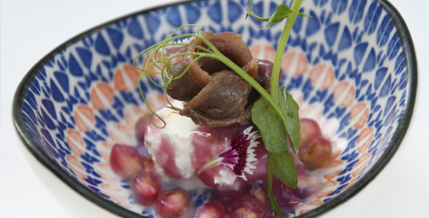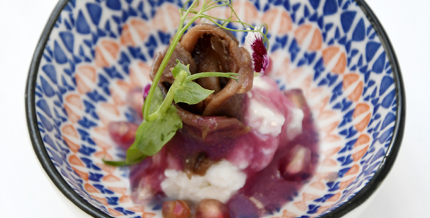 Queso fresco de La Nucía, anchoas del cantábrico, coulis de granada y brotes de guisante. HORARIO DE TAPA: De 12:00 a 19:00hrs.
