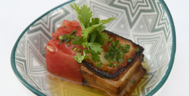 Panceta a baja temperatura, Sandía fresca de la huerta, líquido de cítricos, cebollino y Cilandelo. HORARIO DE TAPA: De 12:00 a 19:00hrs.
