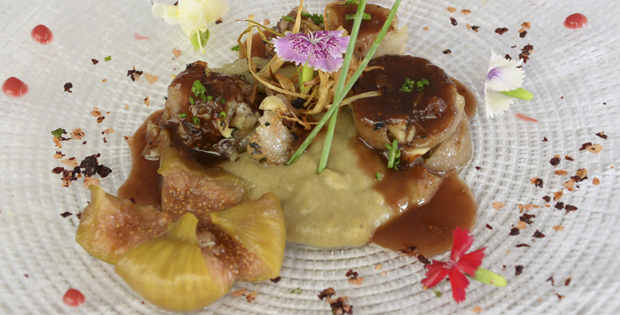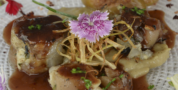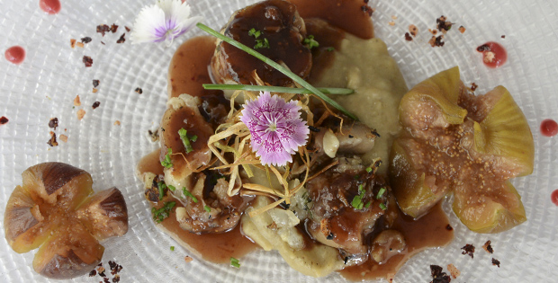 Manitas de cerdo deshuesadas con higos confitados sobre parmentier de berenjena HORARIO: De 12:30 a 16:30 y de 18:30 a 22:30hrs. Martes cerrado