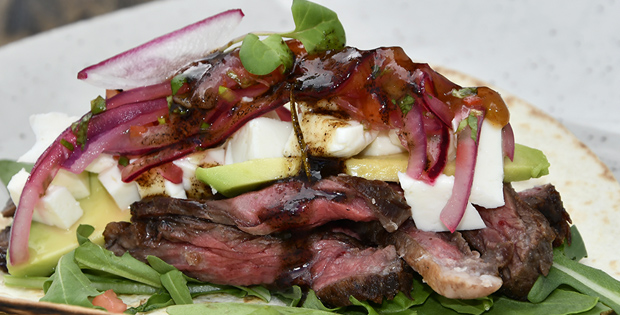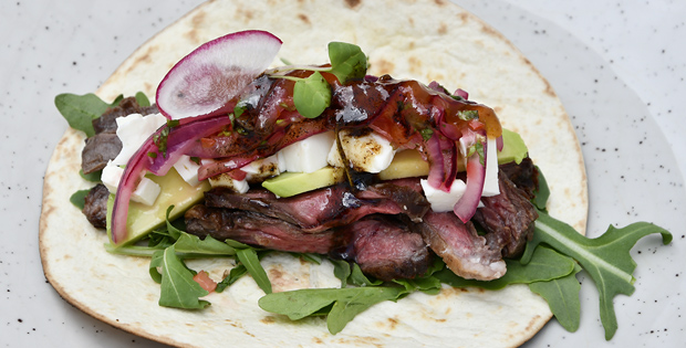 Taquito de entraña con hierbas frescas, aguacate, pico de gallo, queso fresco de la Nucía y chutney
