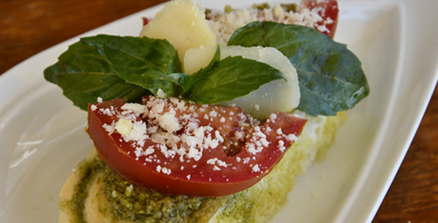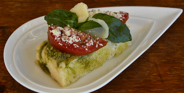 Focaccia con pesto tomate, parmesano y albahaca y aceite de oliva. HORARIO: 12:00-16:00 y 19:00-23:00hrs. Lunes cerrado