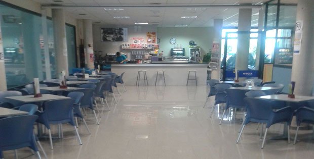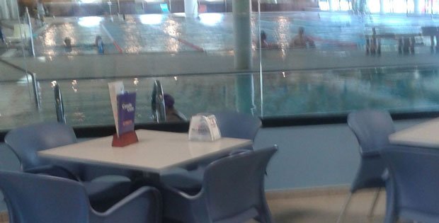 Dentro de la ciudad deportiva puedes tomarte un descanso en esta cafetería donde refrescarte con sus bebidas, disfrutar de su terraza o comer mientras ver nadar a tus hijos.